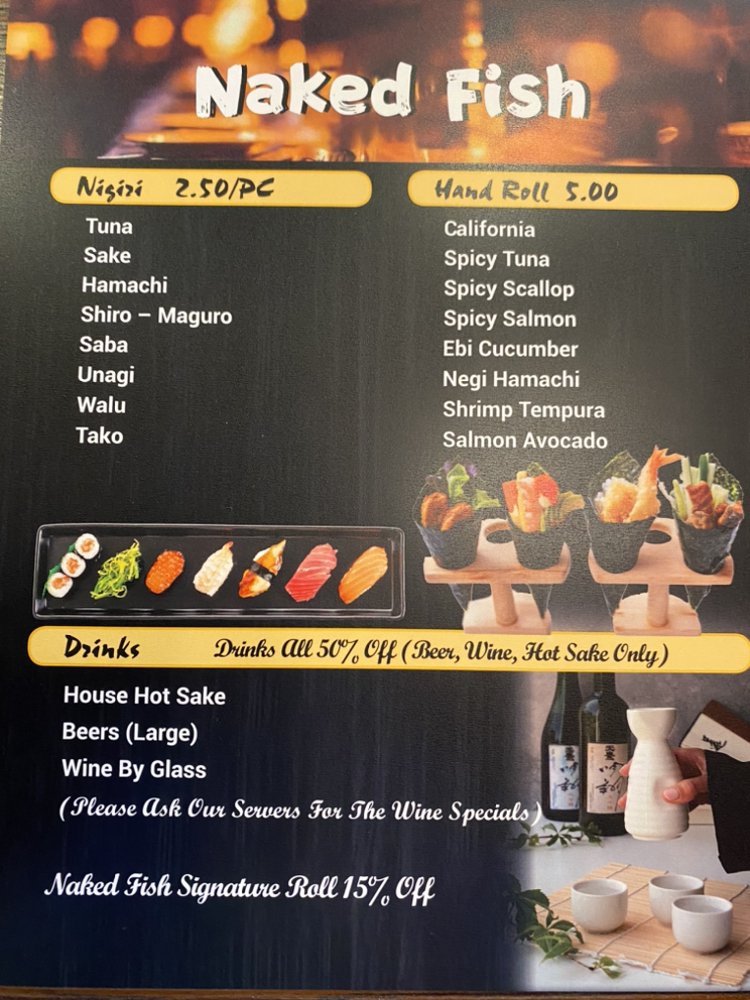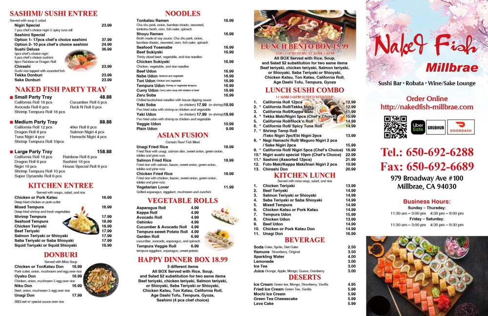 Introducing Naked Fish - Millbrae, a Japanese sushi bar with a diverse menu that includes noodles and many vegetarian options. Located at 979 Broadway Ste 100 Millbrae, CA 94030, this restaurant offers delivery, takeout, and catering services. Customers have praised the attentive service and delicious food, with must-try items like the poke bowl, sushi burrito, G.E.M. roll, and Chicken Katsu Don. The bento box lunch special is also a hit, offering a variety of tasty options at a great price. Despite some decor improvements needed, the overall dining experience at Naked Fish - Millbrae seems promising. So if you're in the mood for Japanese cuisine in a casual setting with friendly staff and prompt service, give this place a try!