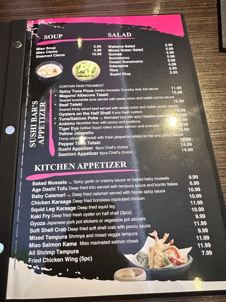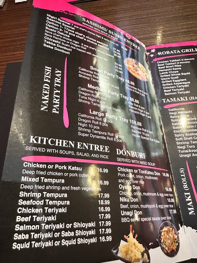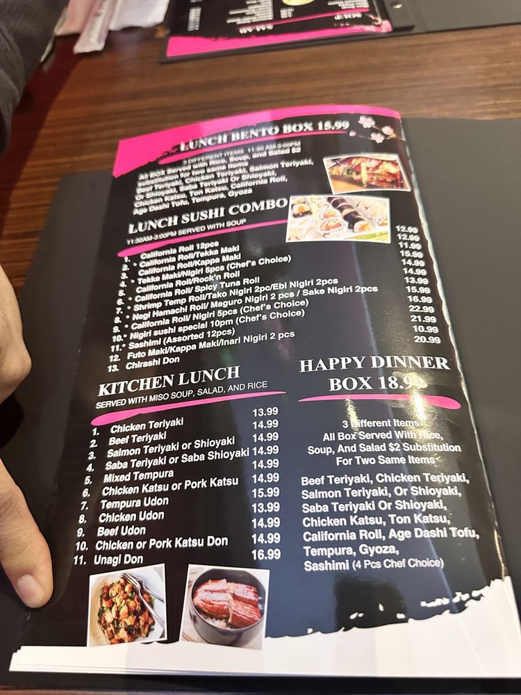 Beef teriyaki, chicken teriyaki, salmon teriyaki, or shioyaki, Saba teriyaki or shioyaki, chicken katsu, ton katsu, California roll, agedashi tofu, tempura, gyoza, sashimi ( pcs chef choice).