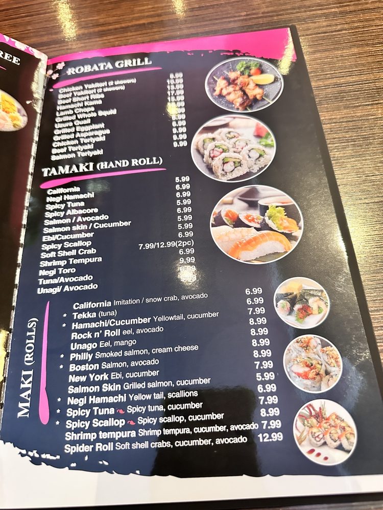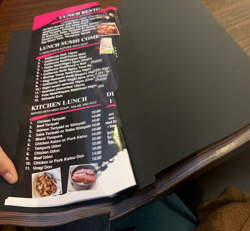 Beef teriyaki, chicken teriyaki, salmon teriyaki, or shioyaki, Saba teriyaki or shioyaki, chicken katsu, Tonkotsu, California roll, Agedashi tofu, tempura, gyoza.
